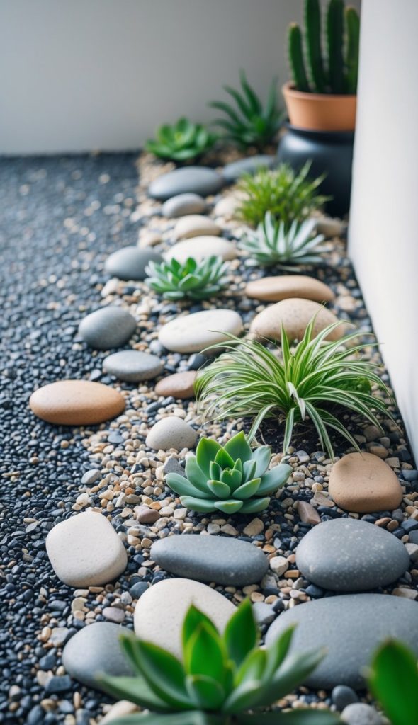 Add gravel behind the stones for extra support. This gives your garden a neat, natural look without needing much water.