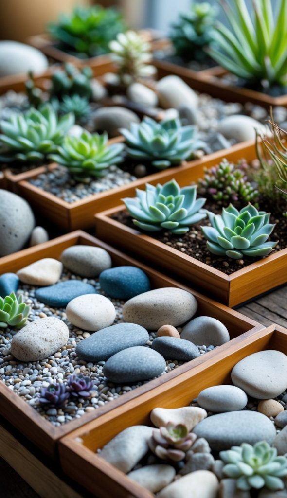 10. Combine stones and succulents in shallow trays