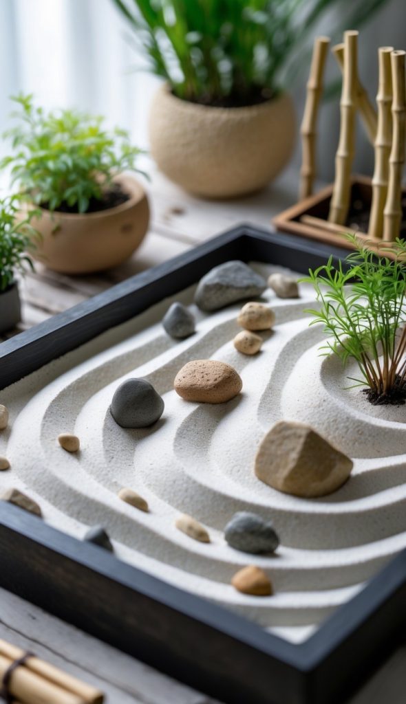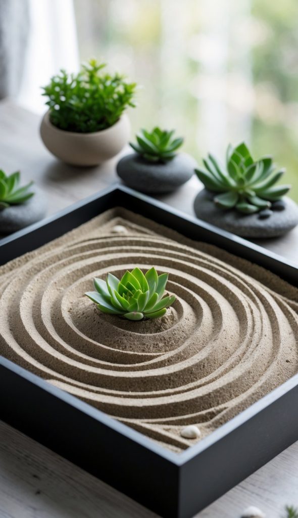 You can create a small zen garden using sand and rocks in a shallow container.