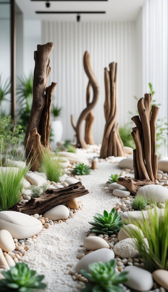 You can use driftwood sculptures to give your indoor dry garden a natural, artistic touch. These pieces blend well with plants and rocks. Driftwood adds unique shapes and texture that catch the eye without needing much care.