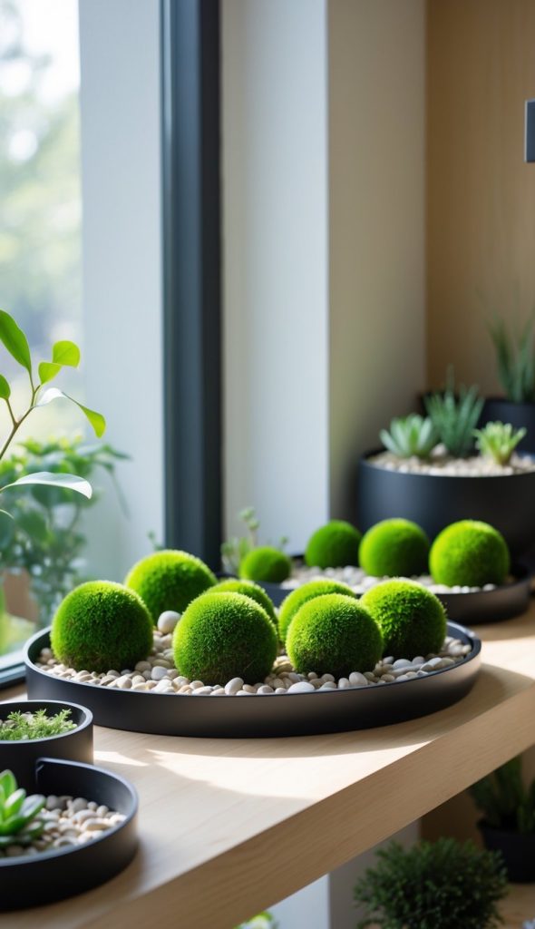 You can add moss balls to small spaces for a fresh, green touch. They need little care and look nice on shelves or tables. Just mist them occasionally to keep them healthy and bright. Moss balls bring natural color without needing soil or big pots.