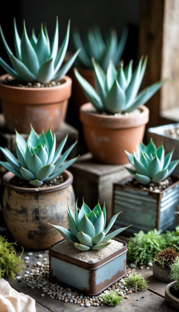 16. Display mini agave plants in rustic containers