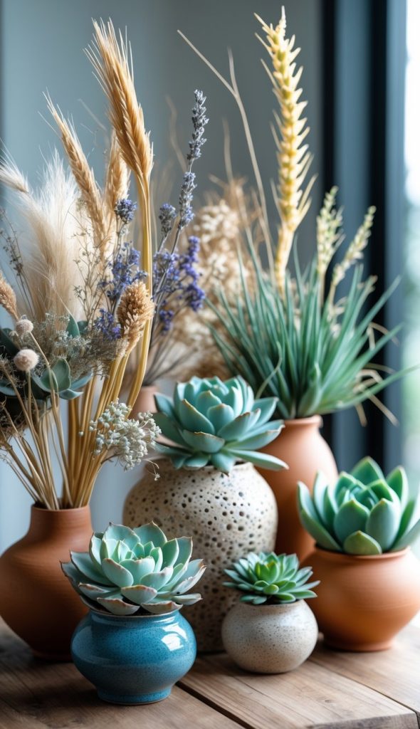 You can mix dried flowers with succulents to create a nice display. The dried flowers add color and texture, while succulents bring a fresh look. Use a shallow container to keep them together and easy to care for.