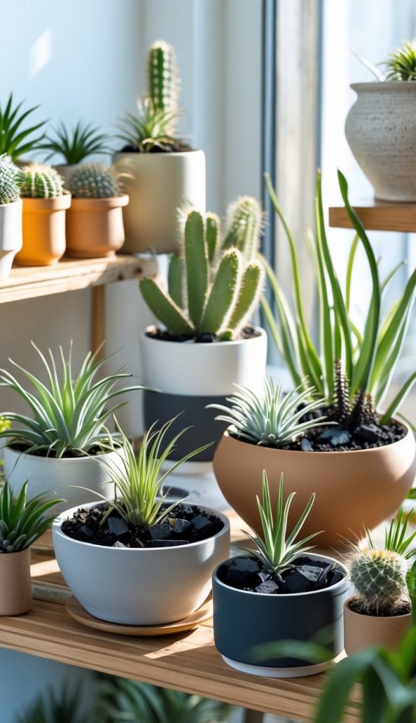 You can add small charcoal pieces to your indoor dry garden soil to keep it healthy. Charcoal helps improve soil structure and absorbs excess moisture. It also supports good microbes that help your plants grow better. Plus, charcoal adds a nice black contrast to your garden’s look.