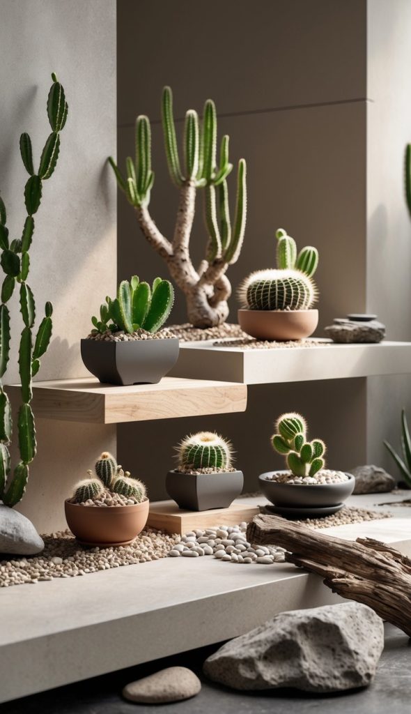 You can add a unique look to your indoor dry garden with bonsai cacti. These small, shaped plants bring a desert feel and look like living art. They are easy to care for and fit well in small spaces.