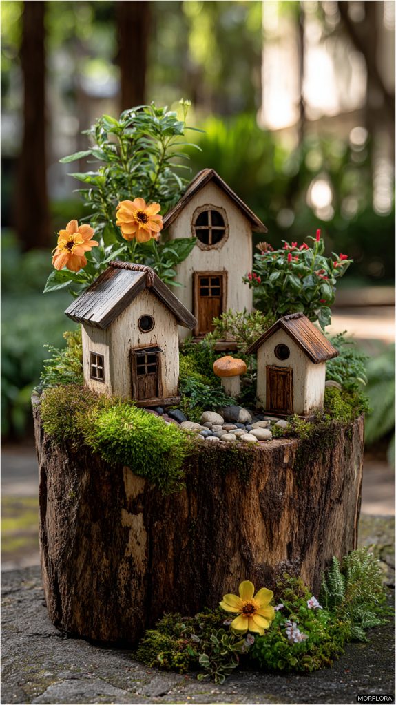 You can turn a tree stump into a charming fairy garden by adding tiny houses and little figurines.