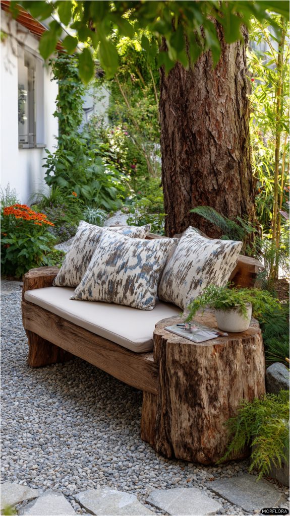 11. Wooden Stump Bench with Cushions