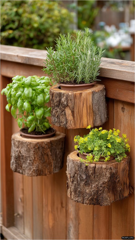 You can turn tree stumps into unique shelves for a vertical herb garden. Mount the stumps on your wall or fence to save space.