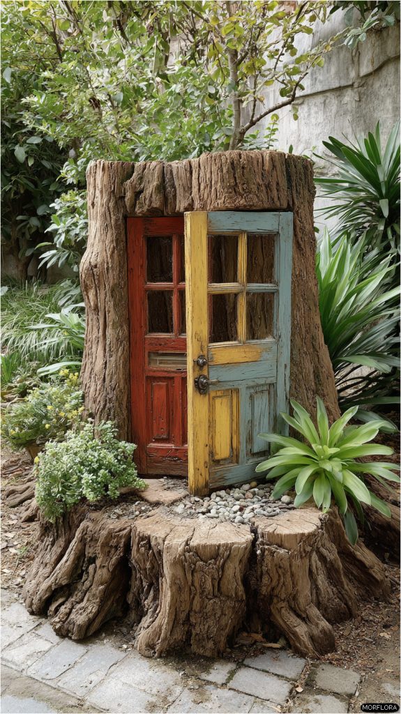 You can add a small fairy door right into your tree stump. This simple touch makes your garden feel magical and inviting.