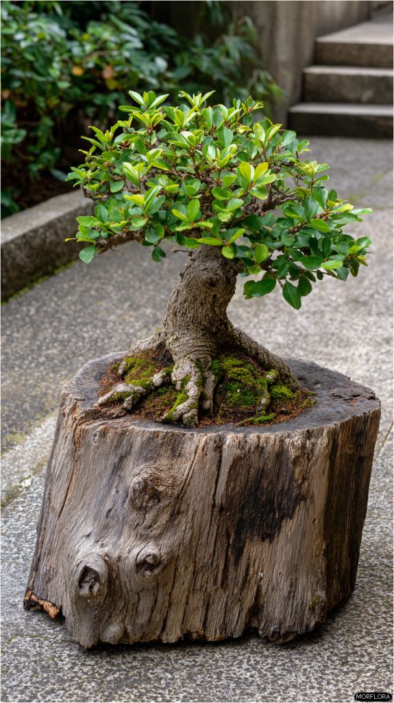 You can create a simple and beautiful display by placing a mini bonsai on a flat tree stump. The natural texture of the stump contrasts nicely with the delicate tree.