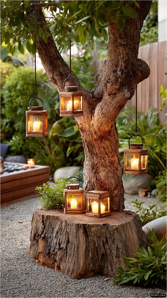 You can add charm to your garden by hanging lanterns around a tree stump. The soft light from the lanterns creates a cozy and calm feeling at night.