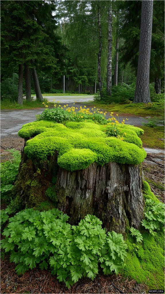 The moss adds a natural feel to your garden. It’s simple to maintain and makes your stump blend well with plants around it. You can even create a small, peaceful corner this way.