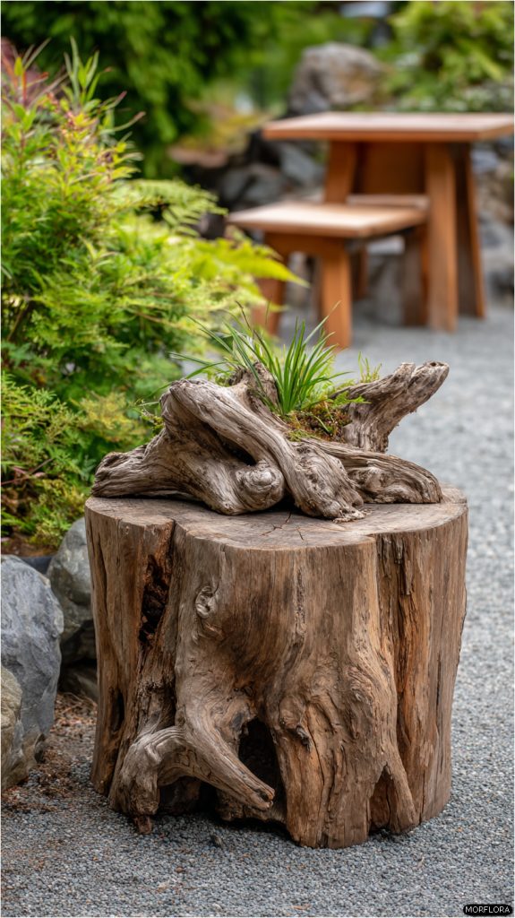 You can add a natural touch by combining weathered driftwood with a tree stump. Driftwood’s soft textures and shapes pair well with the solid, rustic look of the stump.