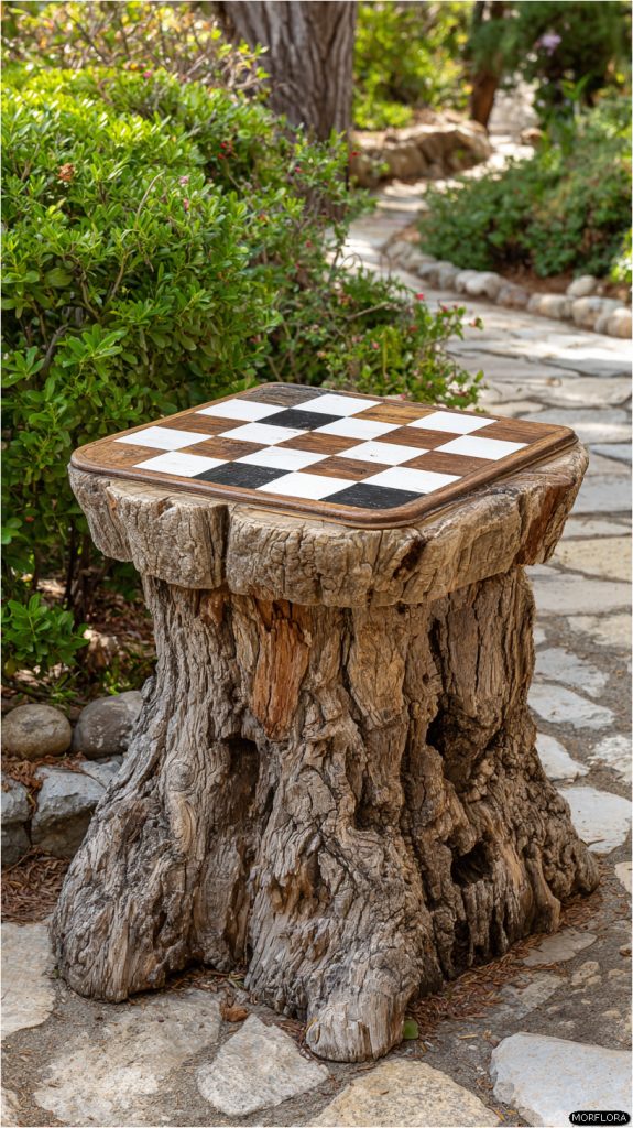 You can turn a tree stump into a fun chess or checkerboard table. Start by sanding the top until it’s smooth. Then, paint or carve the checkered pattern right on the stump.