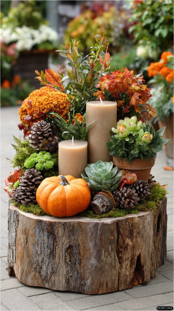 25. Seasonal Decor on Tree Stump Display
