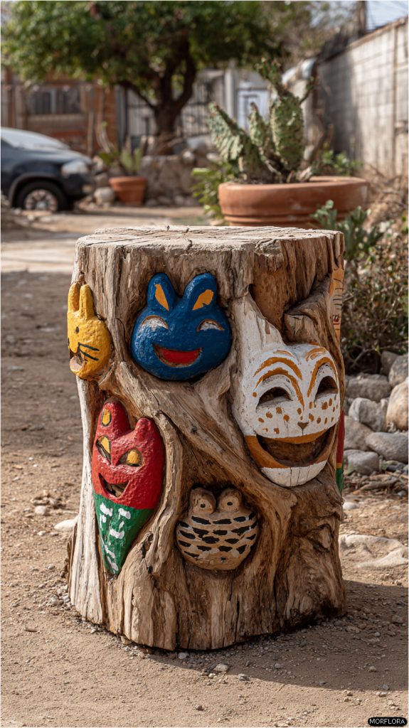 Using weatherproof paint helps your design last longer outside. You can try stripes, dots, or even floral patterns to match your garden style. It’s an easy way to turn a plain stump into a cheerful garden feature.