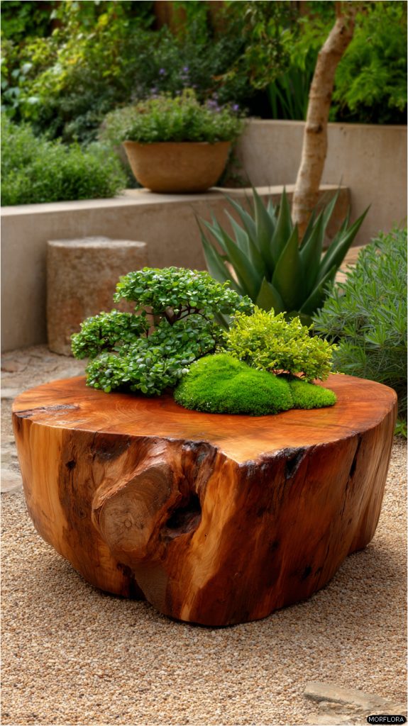 Place a natural wood tabletop on the stump for a smooth surface. This adds a warm, rustic feel to your garden.