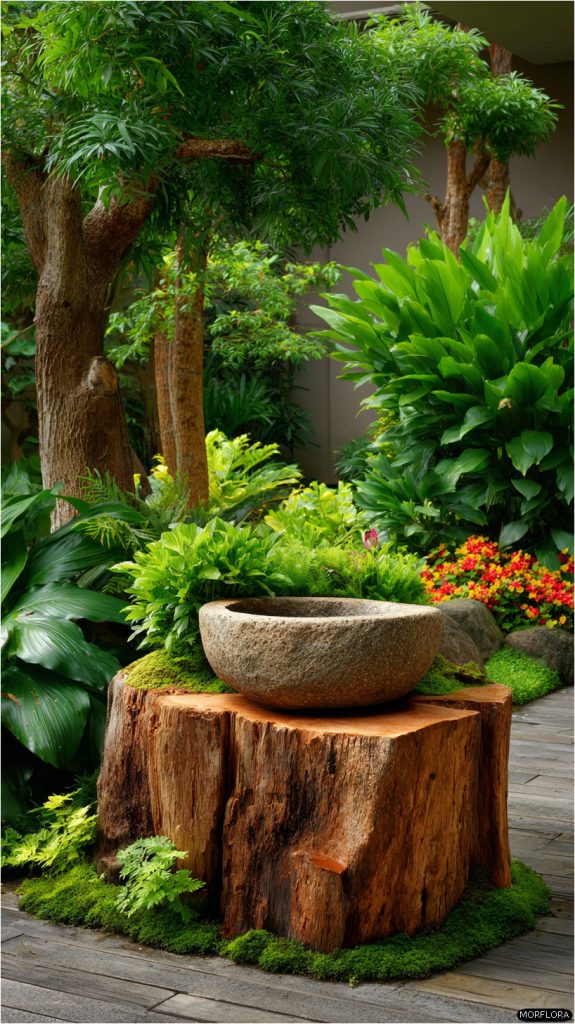You can turn a tree stump into a lovely bird bath by adding a stone basin on top. The stone holds water for birds to drink and splash in.