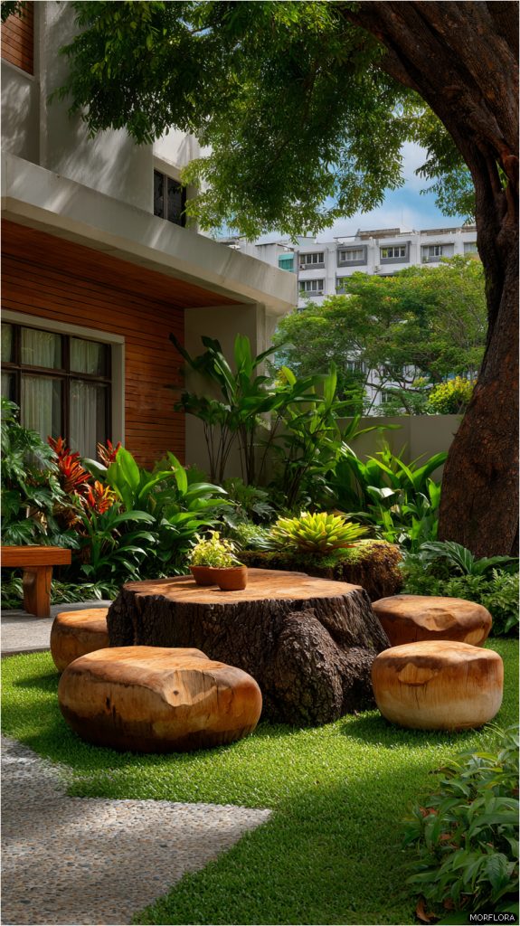 You can create unique side tables by stacking smaller tree stumps on top of larger ones. This adds height and visual interest to your garden seating areas.