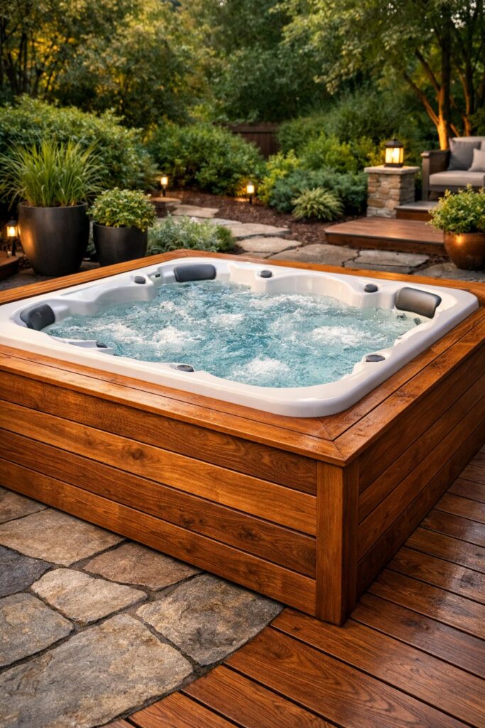 Wrap your Jacuzzi in natural wood paneling to create a warm, cozy feel that blends with your garden. The wood hides pipes and controls while giving the tub a clean, finished look.