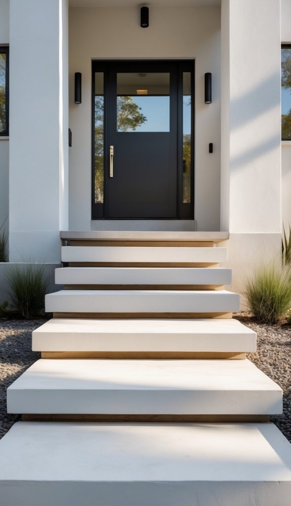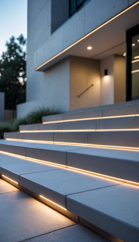 You can add wide concrete steps to create a strong, simple entrance. Built-in LED lights under each step give soft, even lighting. This helps you see clearly at night and adds a modern touch to your home’s front. The lights are practical and look nice without being too bright.