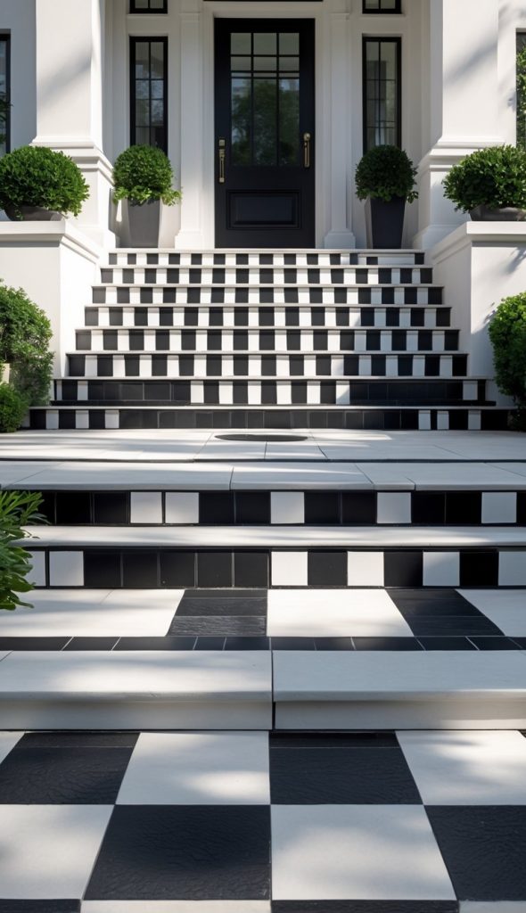 You can use checkerboard tiles on your front steps to add a classic look. The black and white pattern creates a nice contrast that catches the eye. This design works well with both modern and traditional homes. It gives your entrance a neat, stylish feel.