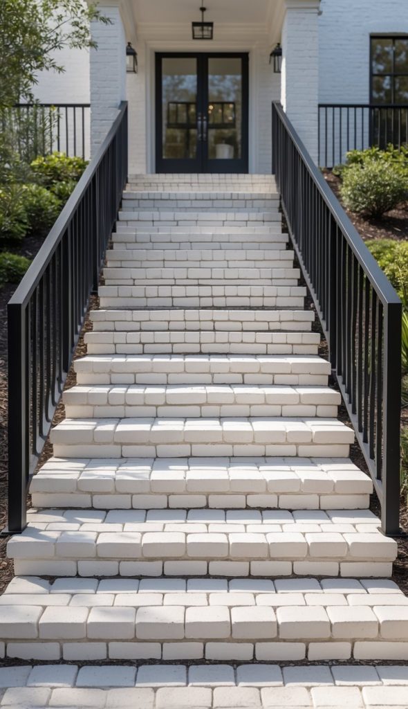 You can brighten your entrance with whitewashed brick steps. This look adds a soft, clean feel without losing the classic brick texture.