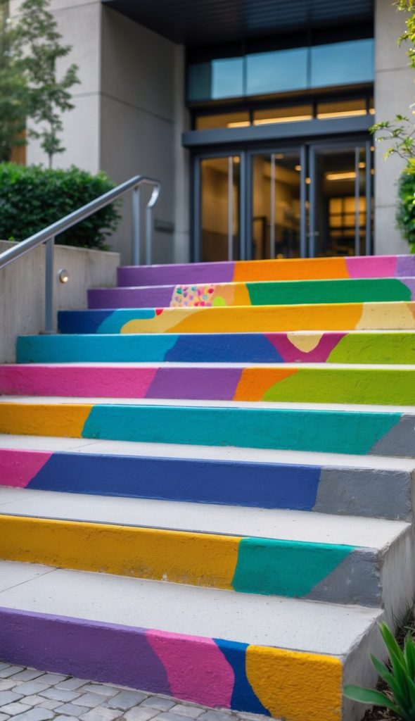 You can brighten your concrete steps by painting the risers in bold colors. This adds a fun touch without changing the whole staircase.