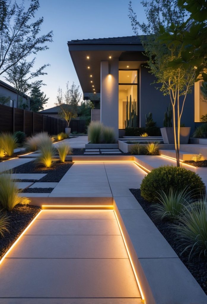 You can brighten your front yard with sleek, modern lighting fixtures. Look for simple designs like LED path lights or wall-mounted sconces. These lights add style and help keep your yard safe at night. Choose fixtures that match your home’s look for a balanced feel.