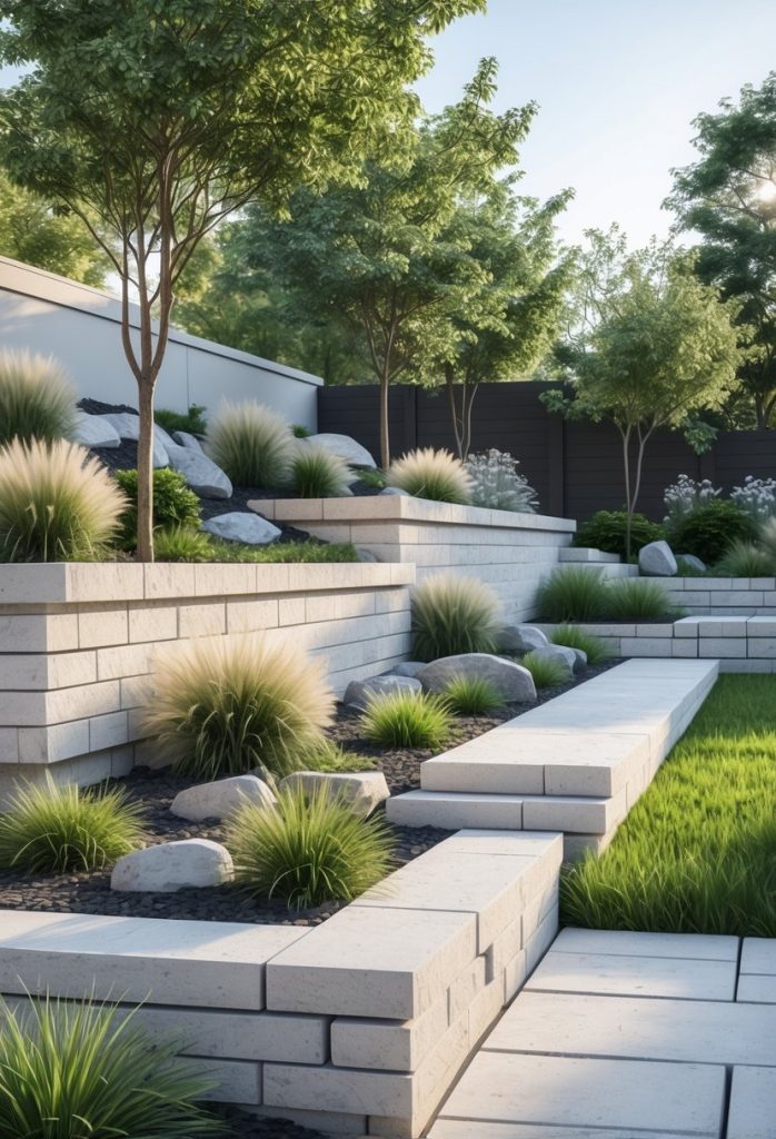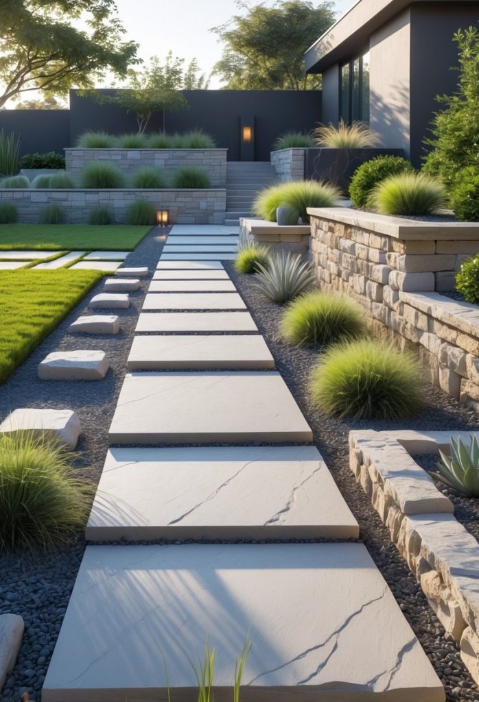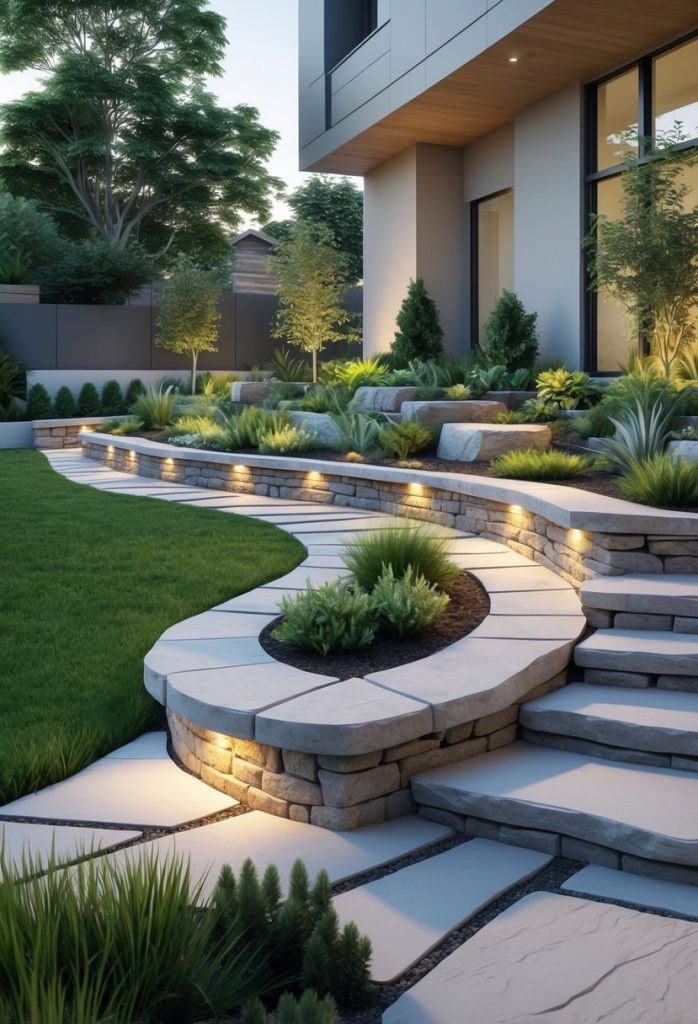 You can add a clean, modern look to your front yard with stone retaining walls that have sharp, defined edges. These walls create strong shapes that make your yard look organized and stylish.