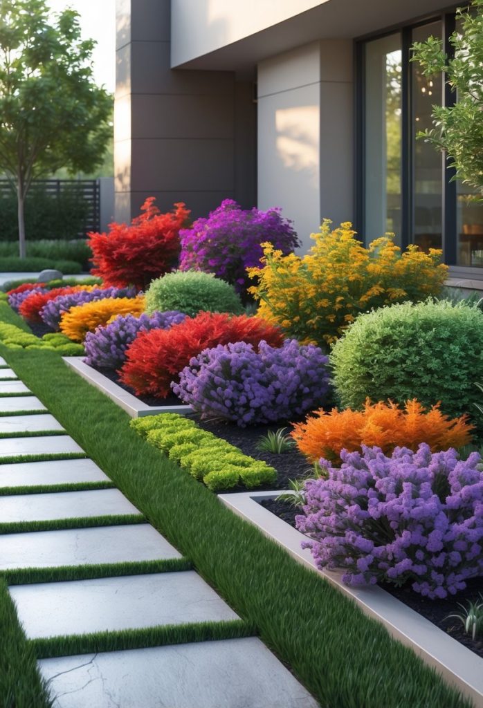 You can create a neat and balanced look by planting the same types of plants on each side of your walkway or door. Symmetry helps your front yard feel organized and welcoming.
