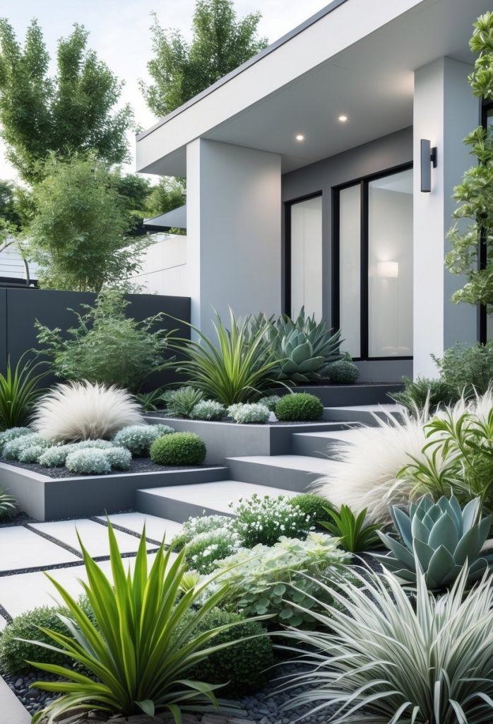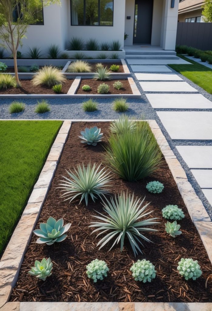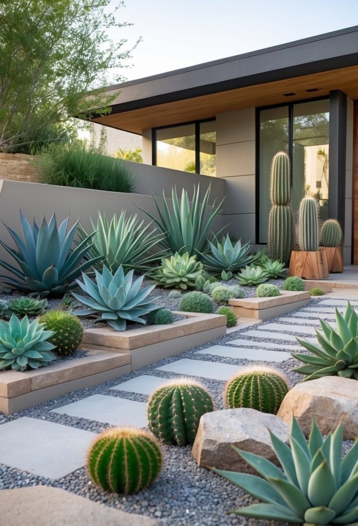 You can create a stylish front yard with succulents and cacti. These plants need little water and are easy to care for.