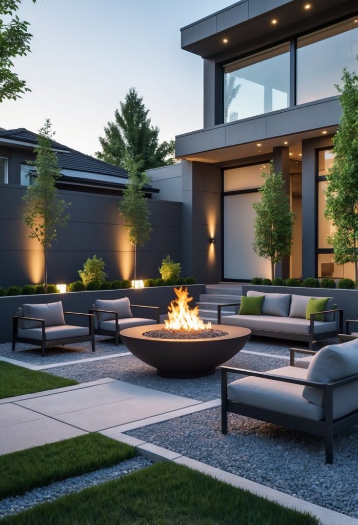 You can create a cozy spot in your front yard by adding a fire pit with sleek, modern seating around it. Choose low-profile chairs or benches with clean lines to keep the look fresh.
