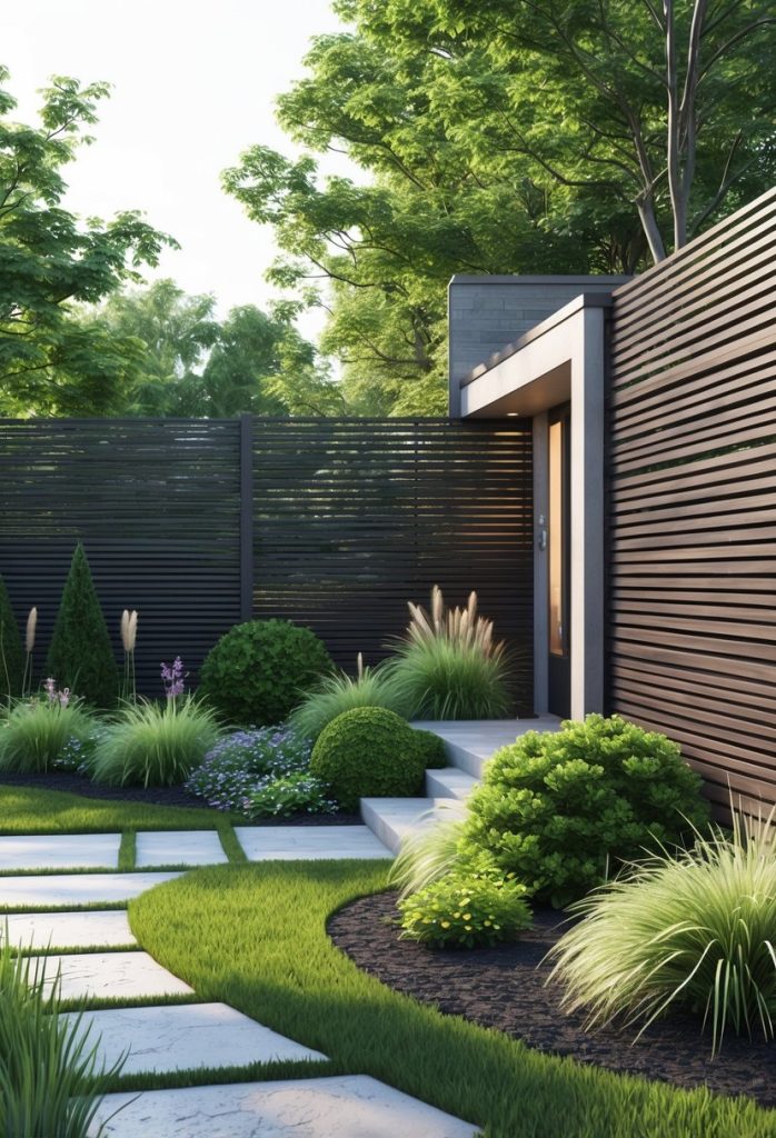 You can add privacy to your front yard with horizontal slat fencing. It looks modern and fits well with many home styles.