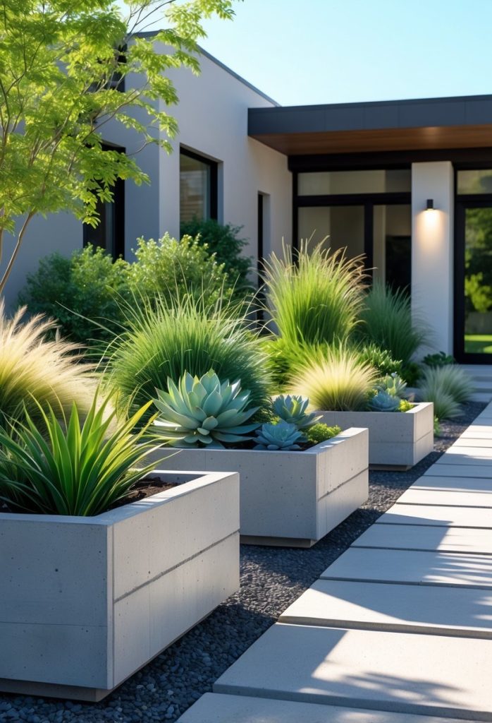 You can add a modern touch to your front yard with concrete planters. Their clean edges create a sleek, simple look. These planters work well with different plants and help keep your space organized. Concrete also lasts long and needs little care, making your yard look neat all year.