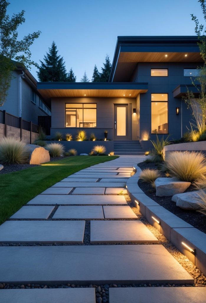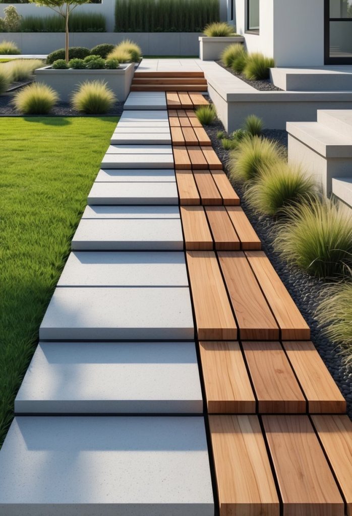 You can create a warm, modern look by mixing concrete and natural wood in your pathways. Concrete offers durability, while wood adds a soft, natural touch. Together, they give your front yard a balanced and inviting feel that works well with many styles.