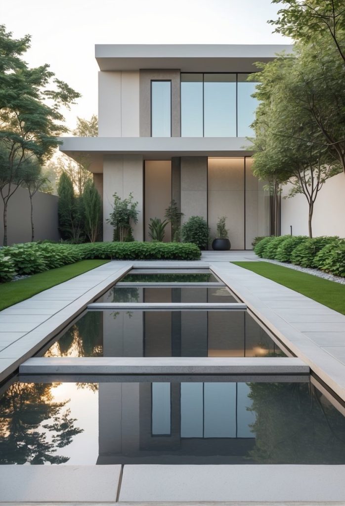 A reflecting pool keeps your yard looking clean and stylish without needing much work. It suits a minimalist design well.
