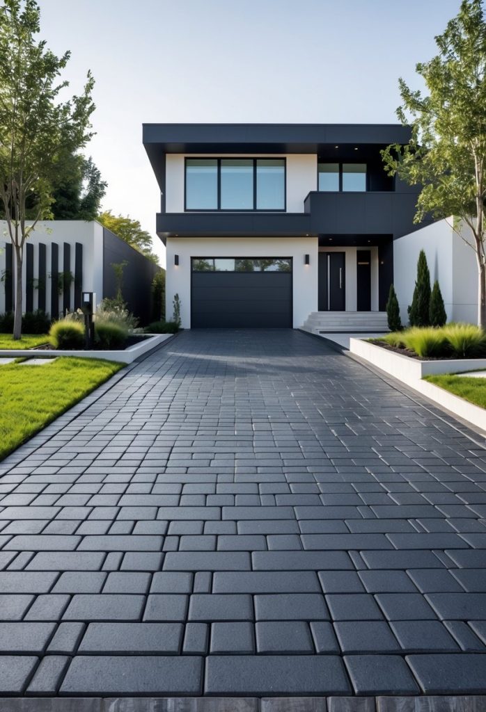 You can add a modern look to your front yard with black or dark grey driveway pavers. These colors give a clean, stylish feel without overpowering your home’s design. Dark pavers also hide dirt better and are easy to keep looking good over time.