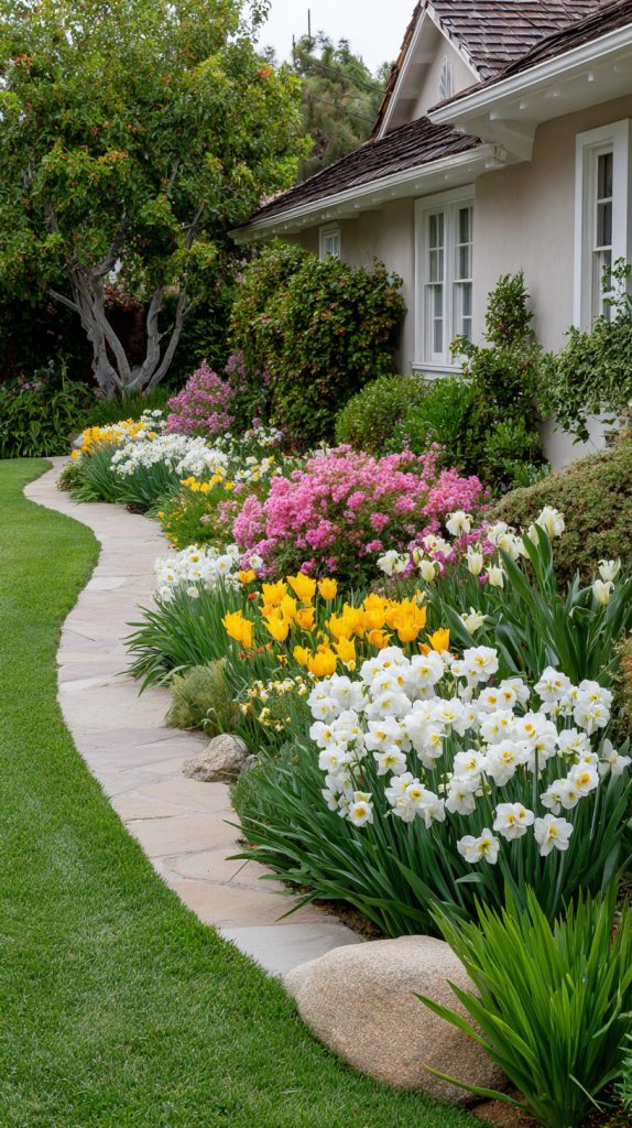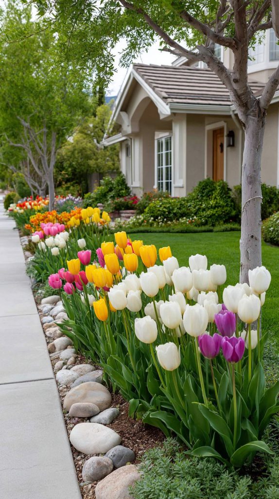 You can brighten your front yard with groups of colorful tulips. Plant them close together to create bold patches that catch the eye.