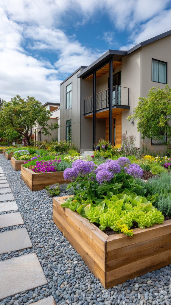 Raised garden beds help you organize your plants and add height to your front yard. They keep soil healthy and stop weeds from growing.