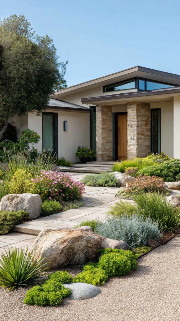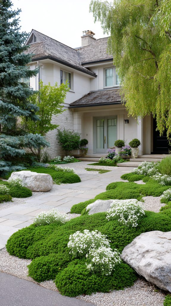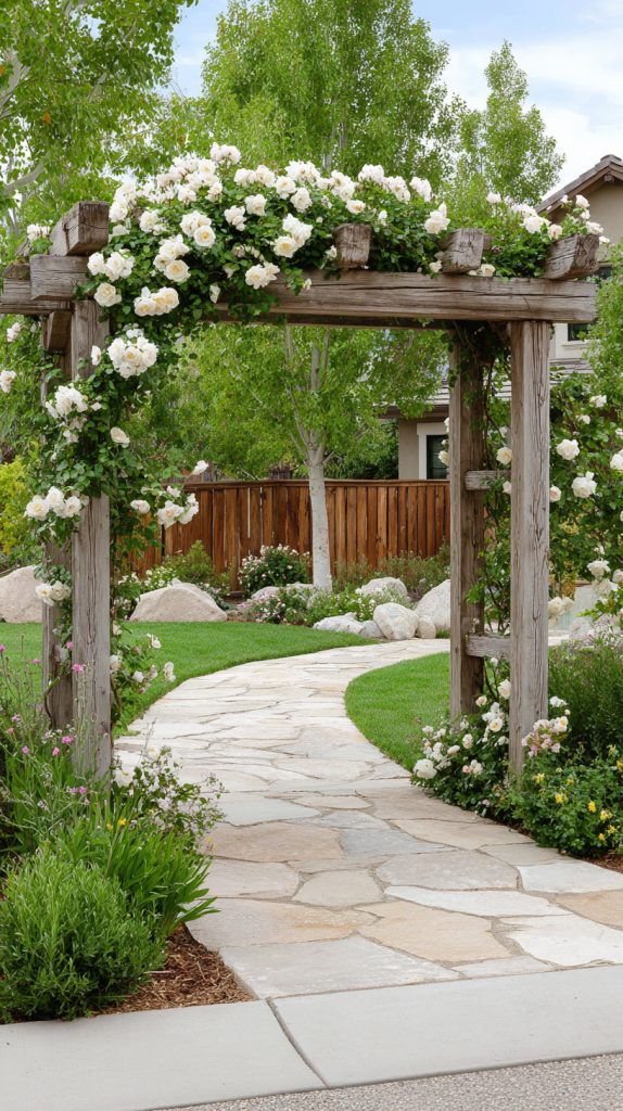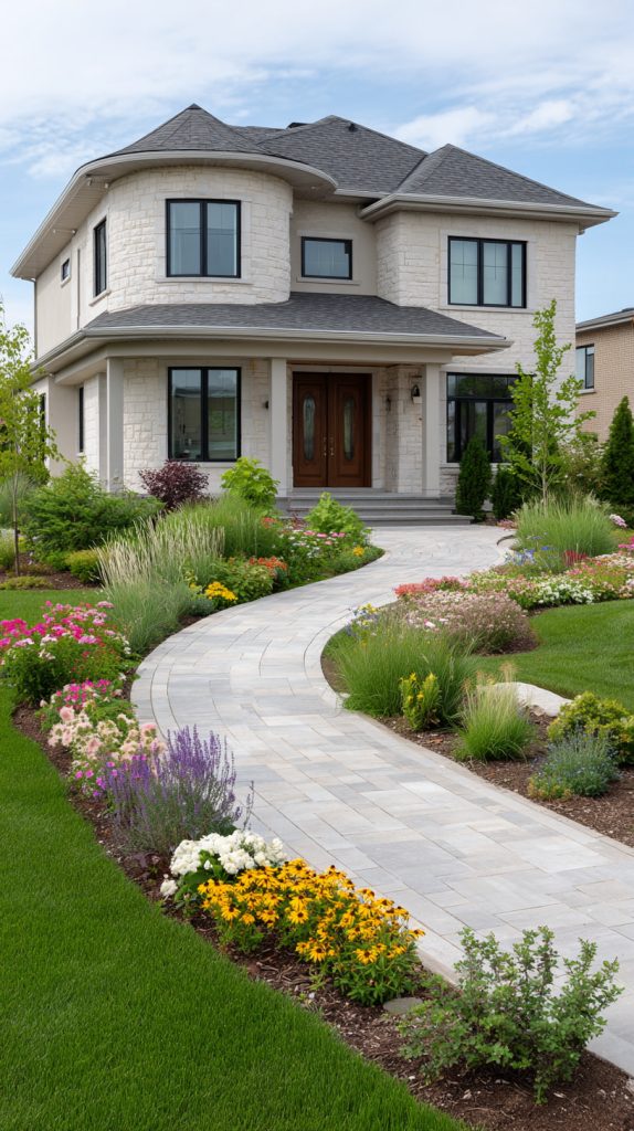 You can create a lovely, natural look with curved stone walkways in your front yard. They guide visitors gently through your garden, adding a soft flow to your outdoor space.