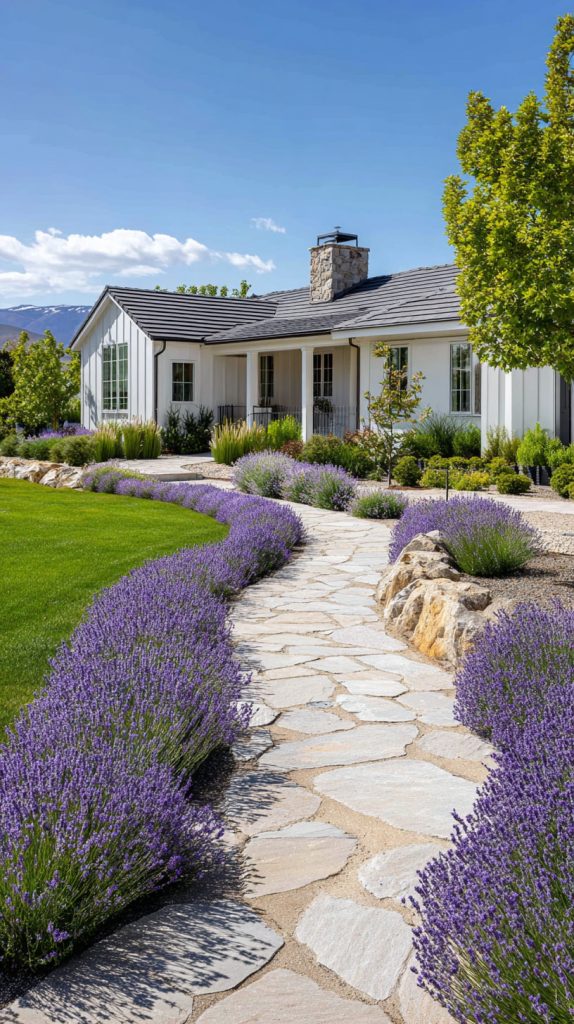 You can create a charming path by planting lavender along the sides. The soft purple flowers add color and a lovely scent as you walk.