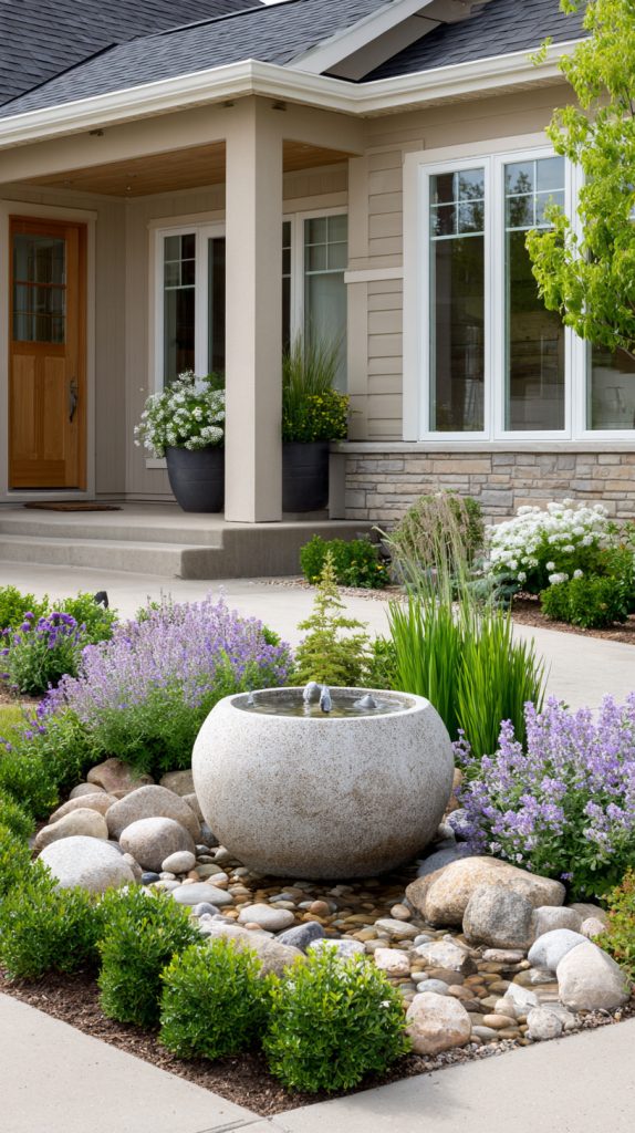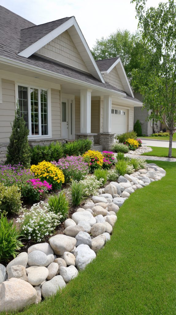 River rock edging is low-maintenance and works well with many garden styles. It’s a great way to keep soil and mulch in place while adding texture to your front yard.