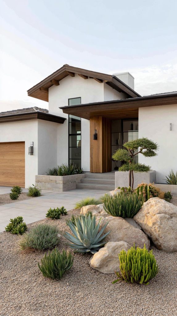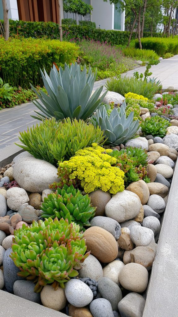 Choose a mix of colorful succulents and smooth rocks to make it look natural. Mini rock gardens fit well in small spaces or corners near your doorstep.