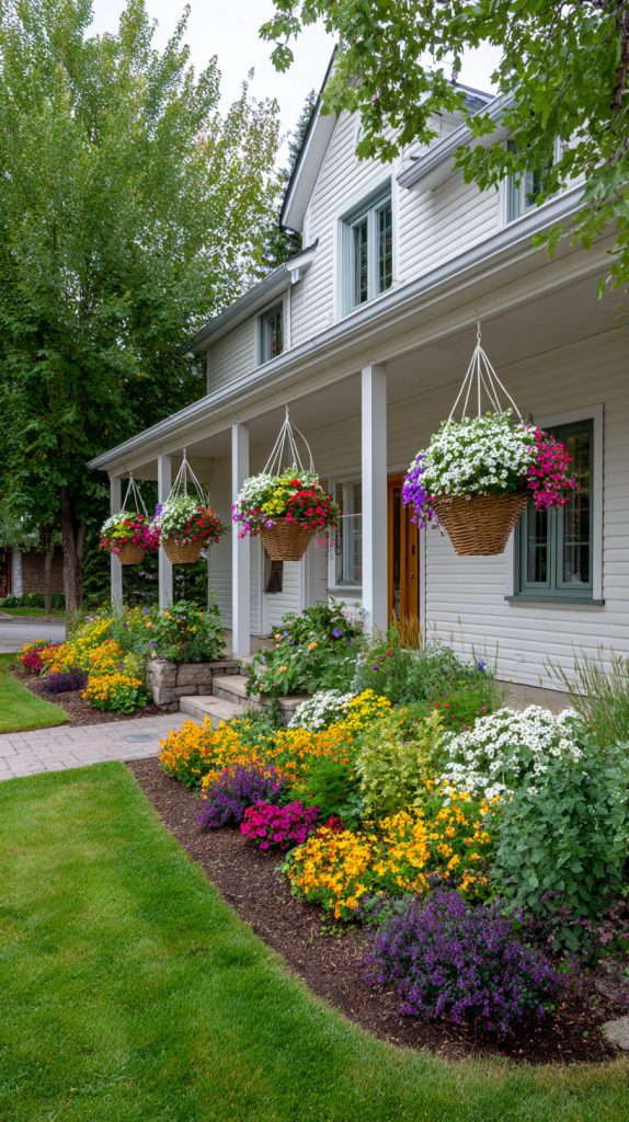 Hanging flower baskets add color and charm to your front yard without taking up ground space. You can hang them on your porch, walls, or trees to brighten dull corners.
