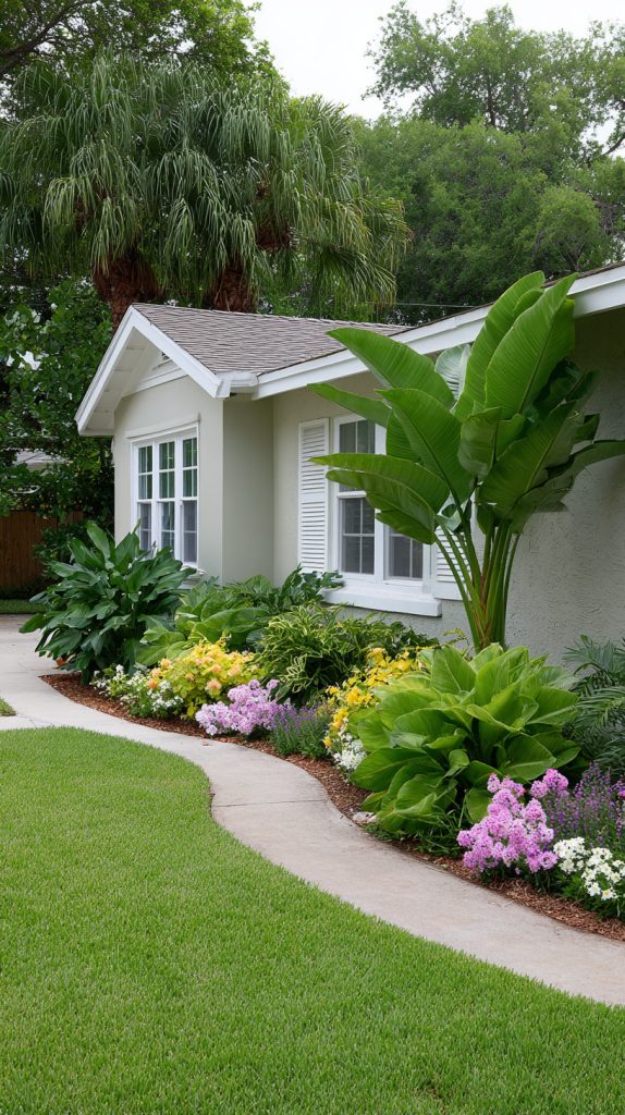 You can add a striking look to your front yard with bold tropical foliage plants. These plants have large, colorful leaves that grab attention.