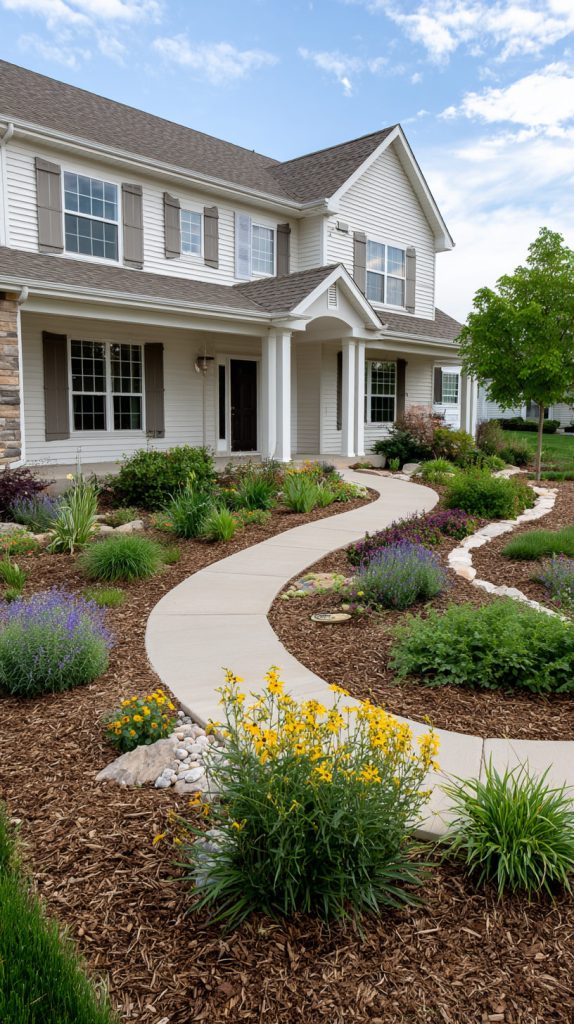 Natural mulch pathways bring a warm, earthy feel to your front yard. They blend easily with plants and help keep weeds down.