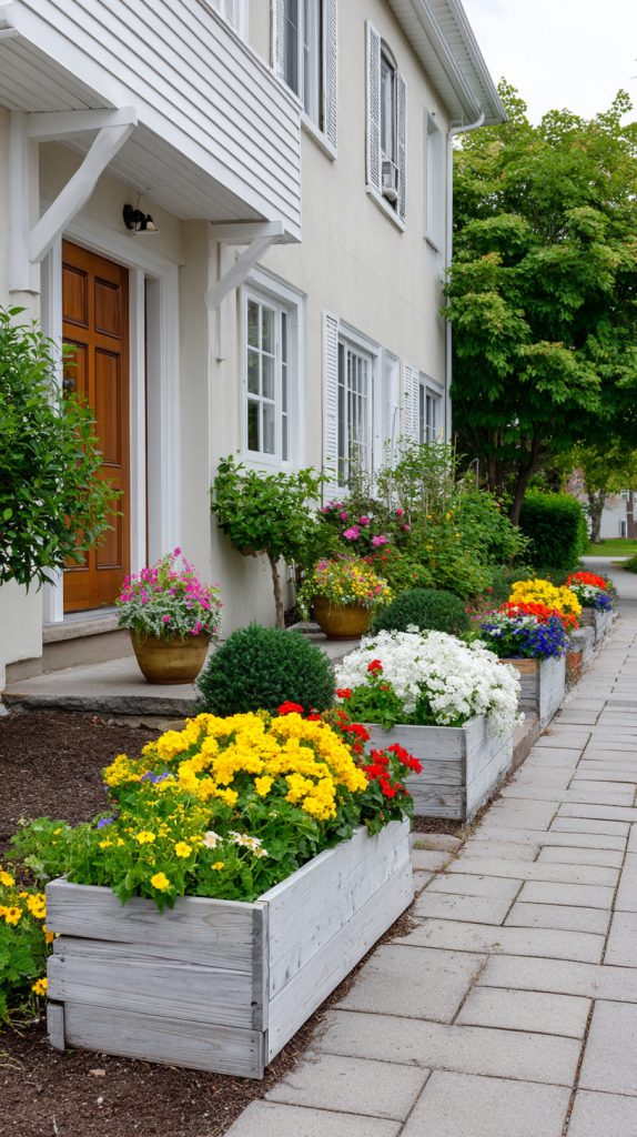 You can add charm to your front yard with decorative planter boxes. They come in many styles, from rustic wood to modern designs.