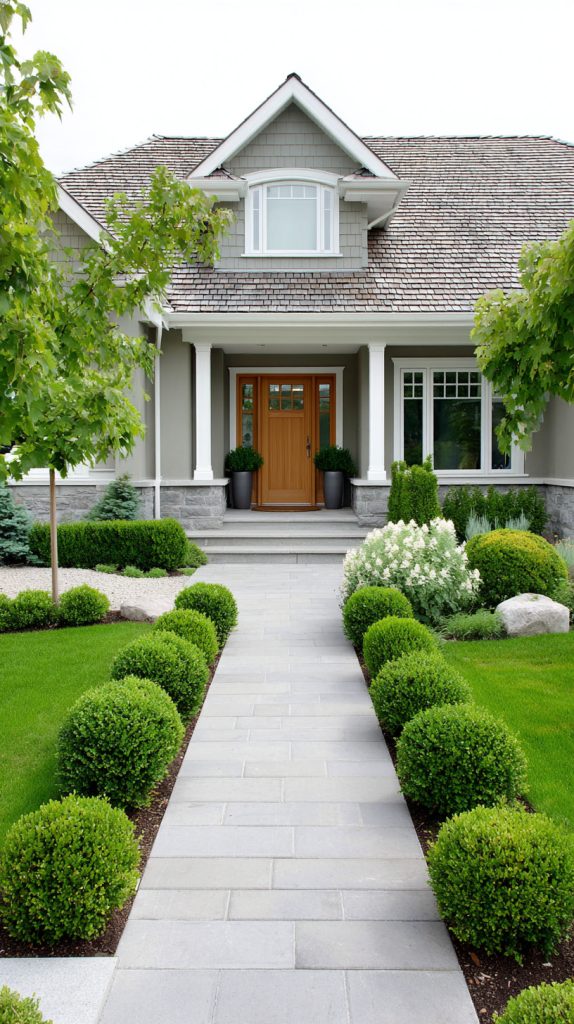 You can create a clean, balanced look by planting symmetrical foundation shrubs on either side of your front door. This design adds a neat and welcoming feel to your home’s entrance. Choose shrubs that stay a similar size and shape for easy maintenance and a polished appearance. Symmetry helps your yard look organized and inviting without much effort.