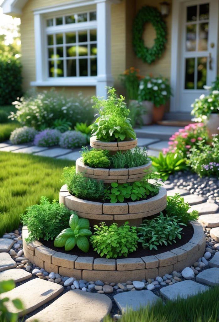 You can add a small herb spiral garden to save space in your front yard. It uses vertical height to grow many herbs in a small area. This design also creates different spots for herbs that need more sun or shade.